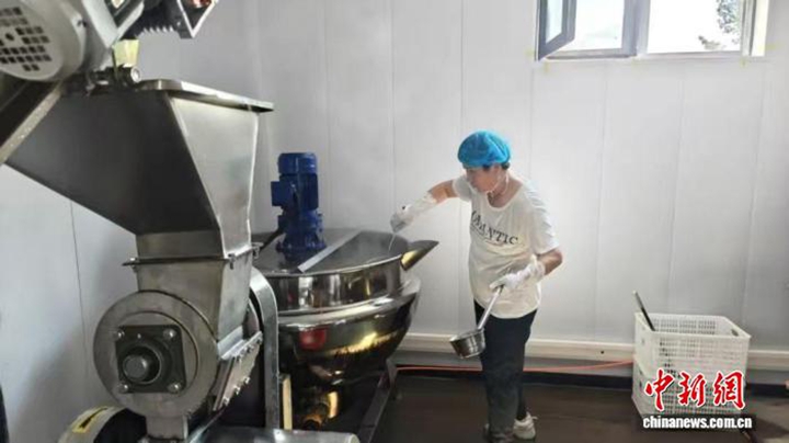 进入试生产车间,工人们熟练地操作设备,清洗、压榨、熬煮、灌装……经过筛选的玉露香梨晶莹饱满,送入生产线后采用低温压榨工艺,最大程度锁住梨汁清冽甘甜的本味,而经过数小时慢火熬制的梨膏,逐渐转化成透亮的琥珀色,浓郁的果香随热气徐徐升腾。