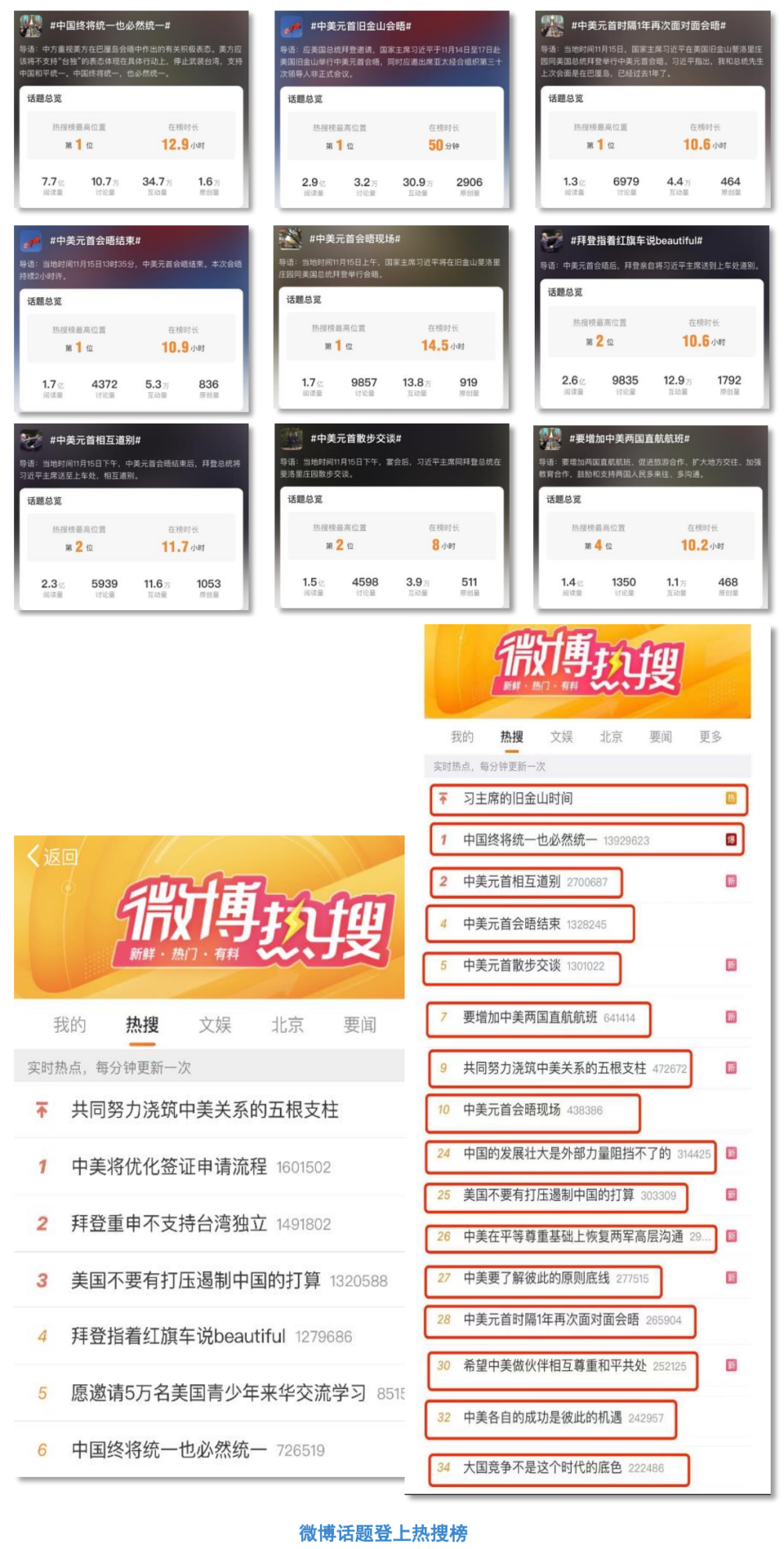 精设议题,互动话题全部登上热搜榜!央视新闻微博及时提炼会晤中习主席重要观点、重要论断,发起#习主席的旧金山时间#、#中美元首会晤现场#、#共同努力浇筑中美关系的五根支柱#等30个互动话题,全部登上热搜榜,总阅读量超40.1亿。其中,#中国终将统一也必然统一#、#拜登重申不独立#等15个话题持续占据热搜榜首位。网友纷纷留言:“人类的福祉,就是大国和平相处。”“旧金山成为新起点!”